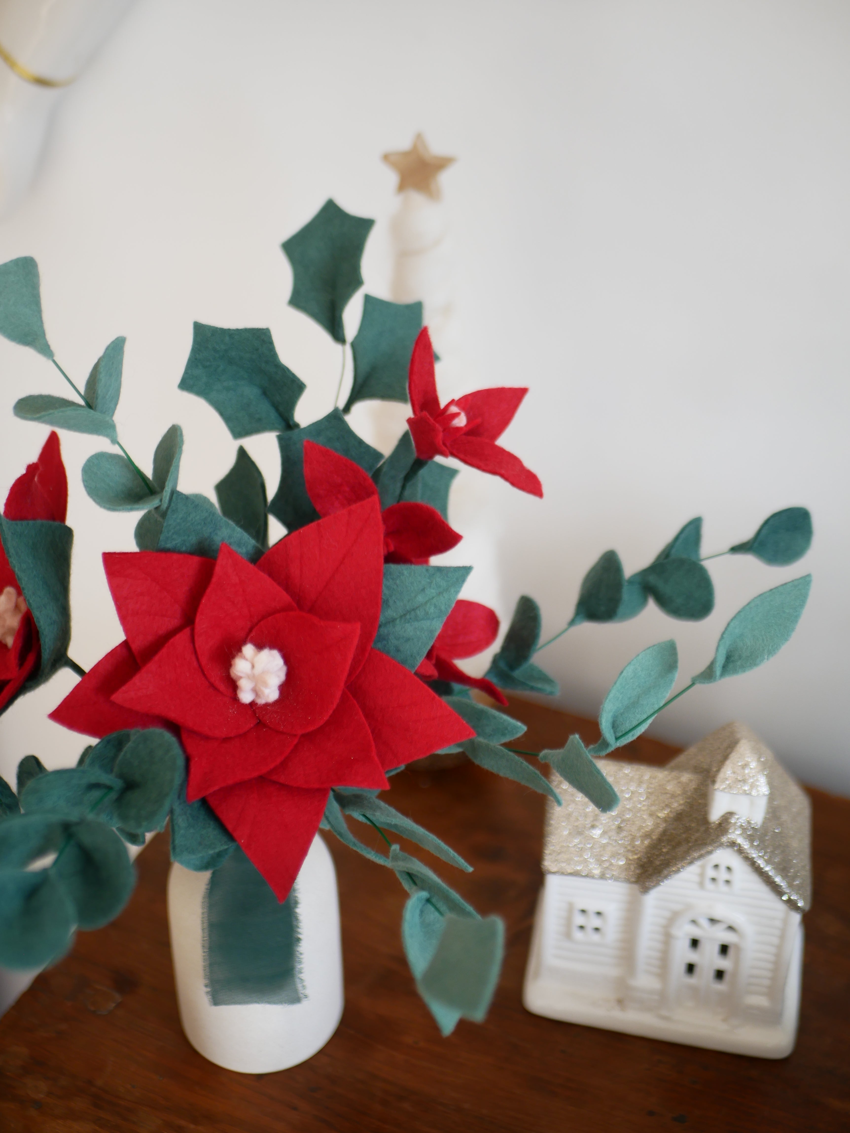 Plongez dans la féerie de Noël avec ce magnifique bouquet d’eucalyptus et de poinsettias. Il évoque la chaleur et les festivités de Noël en famille.