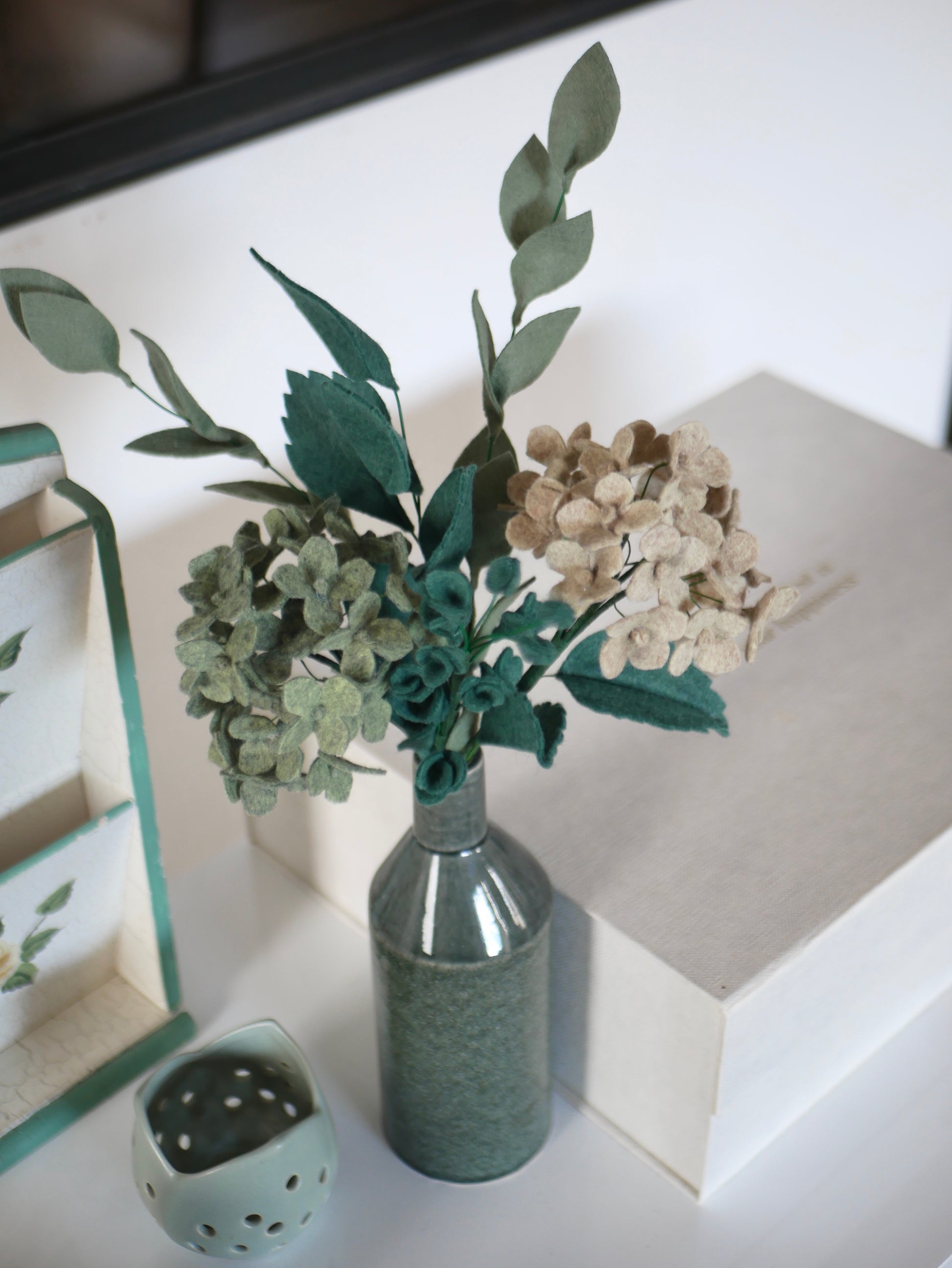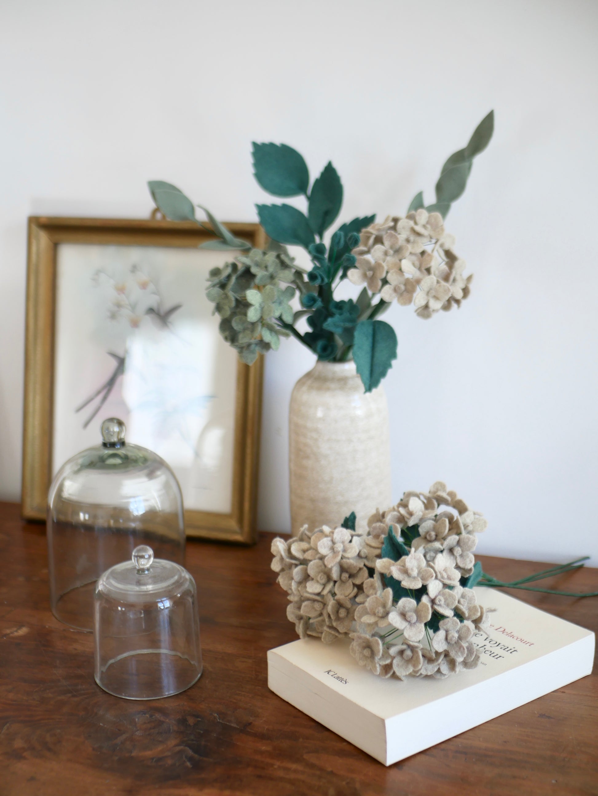 Bouquet fin et délicat d’hortensias, de feuillage et d’eucalyptus pour apporter de la douceur dans votre intérieur .