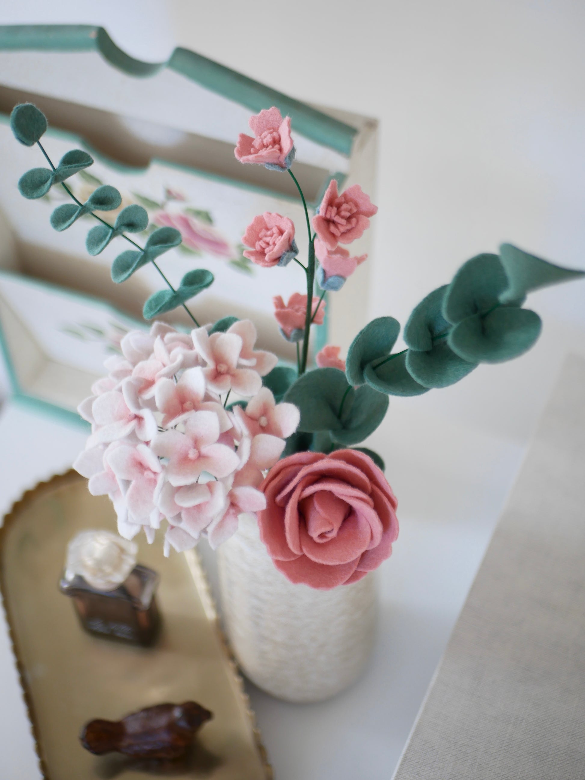 Bouquet fin et délicat avec une fleur d’hortensia, une rose, des petites fleurs et de l’eucalyptus pour apporter de la douceur dans votre intérieur .