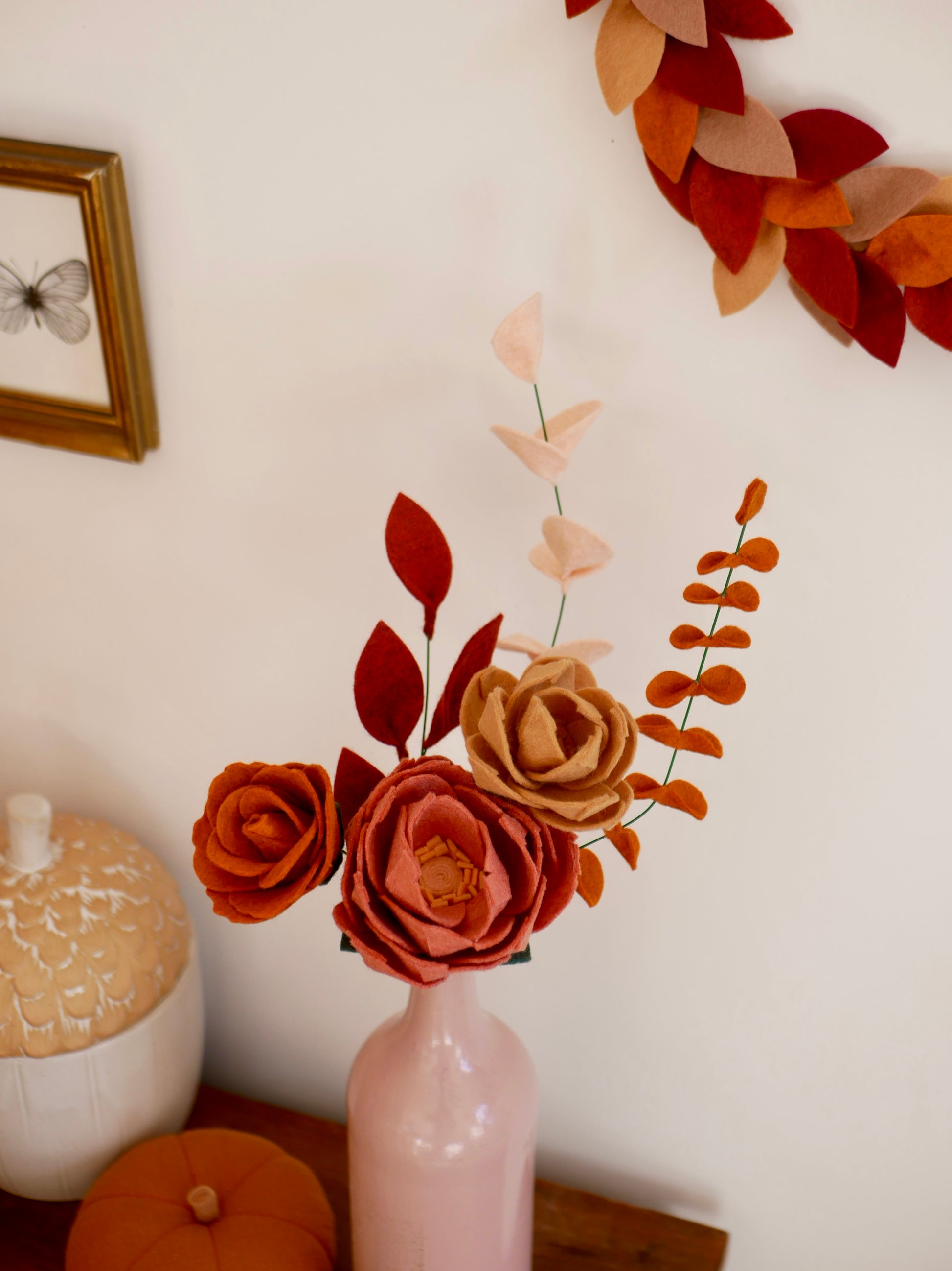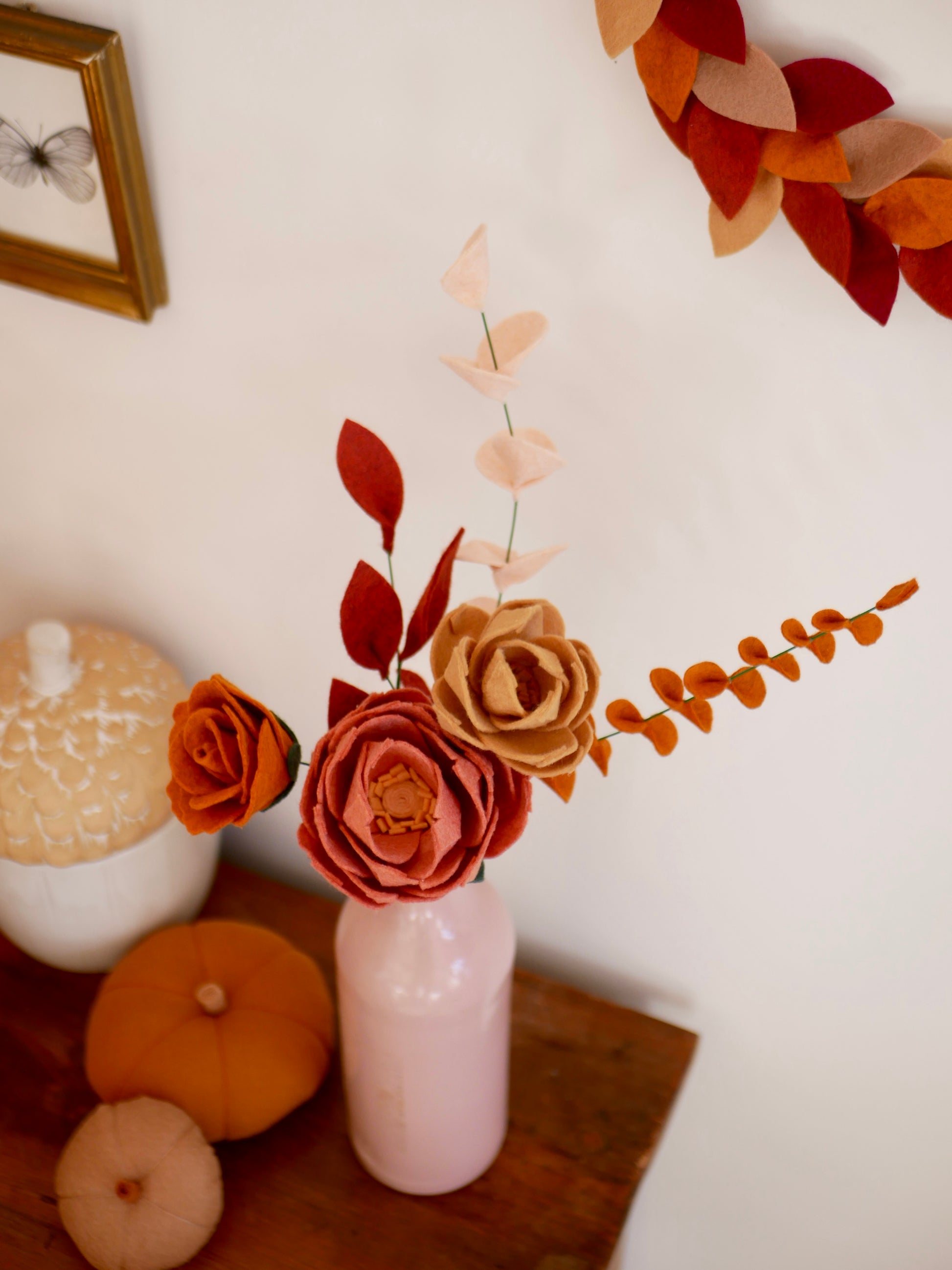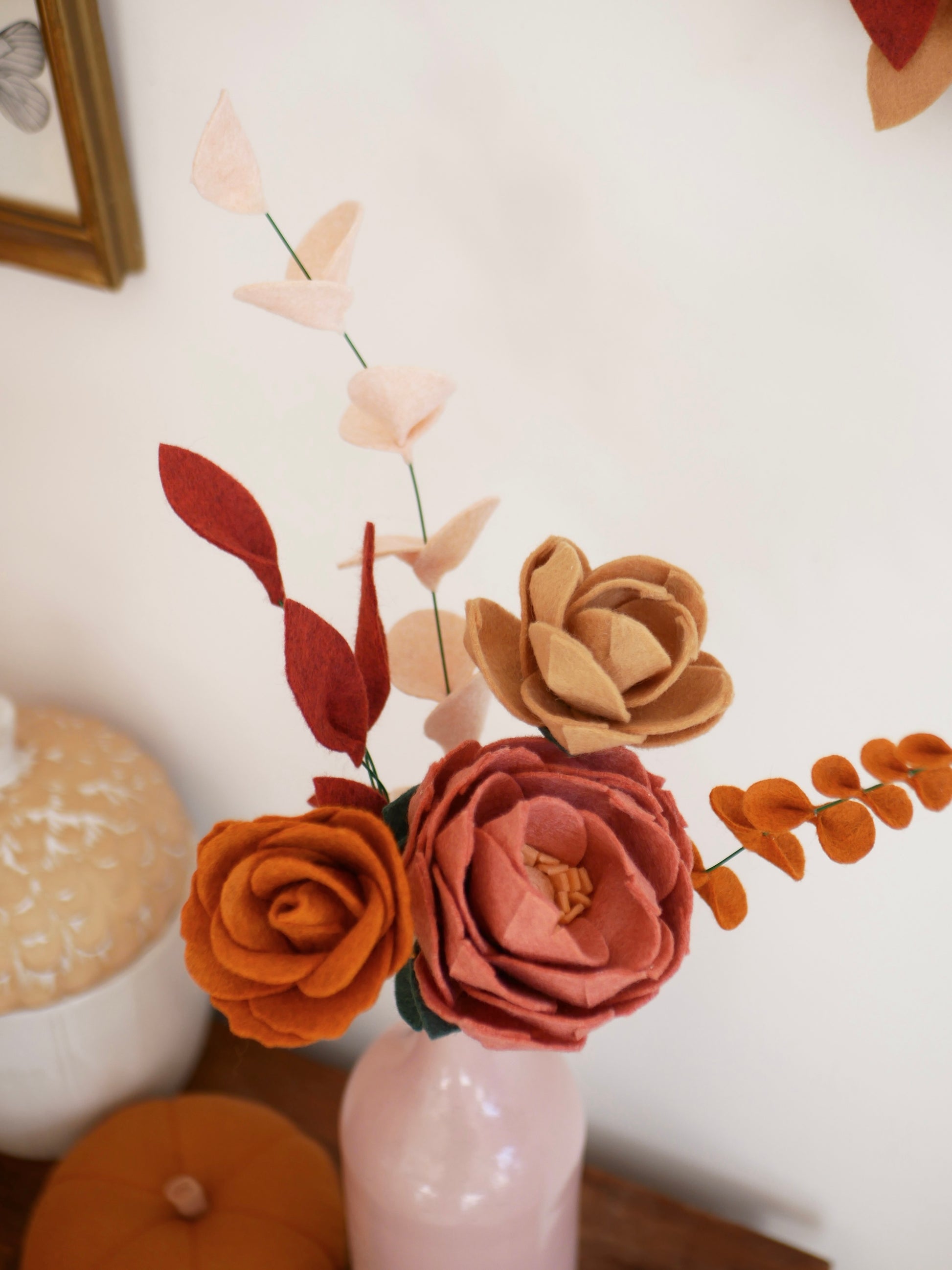Bouquet fin et délicat dans des teintes automnales avec une jolie pivoine, du craspedia, une rose ancienne, du feuillage et de l’eucalyptus pour apporter douceur et chaleur dans votre intérieur .