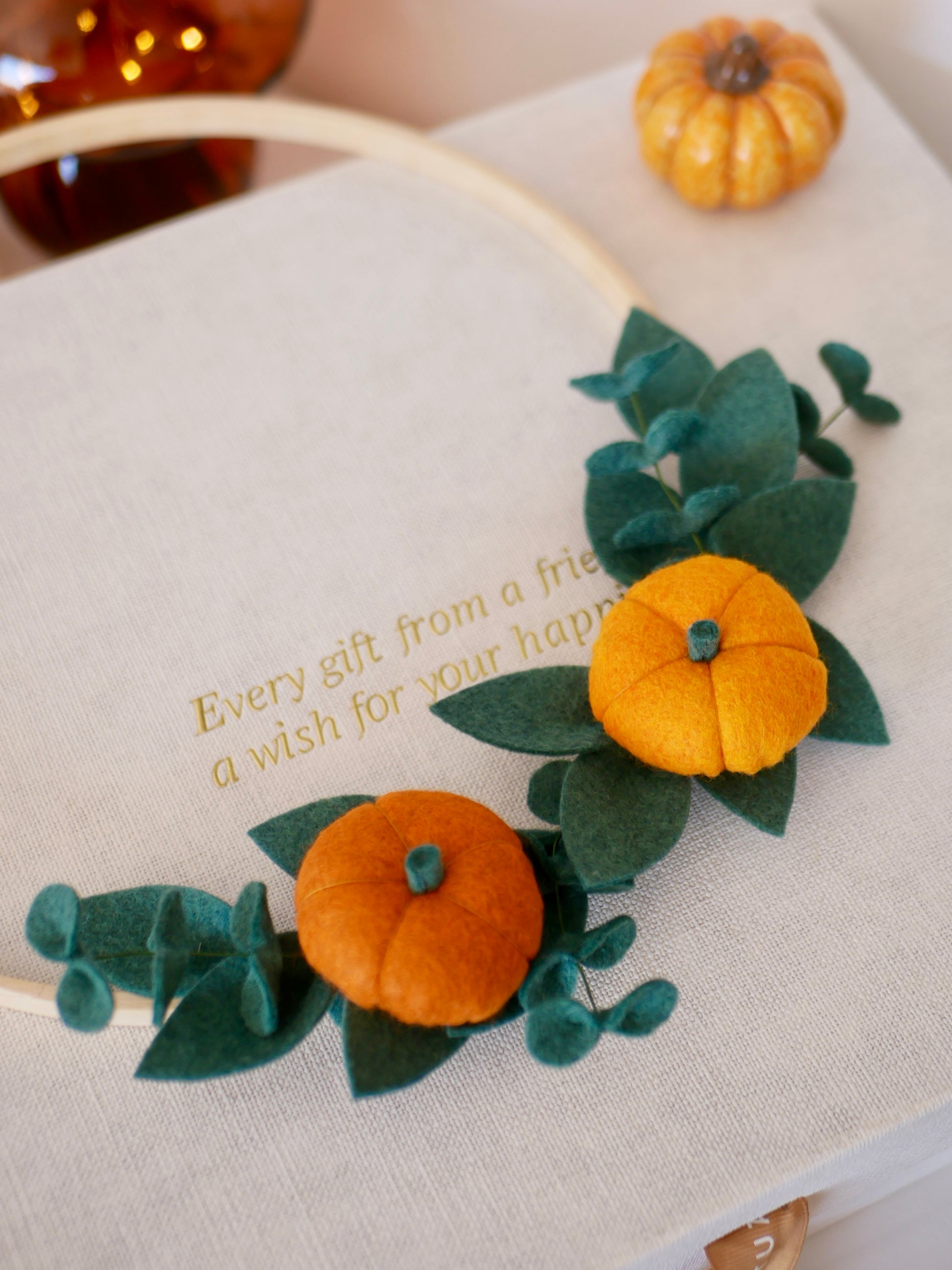 Cette jolie couronne, entièrement fabriquée à la main, est confectionnée en feutrine de coton.