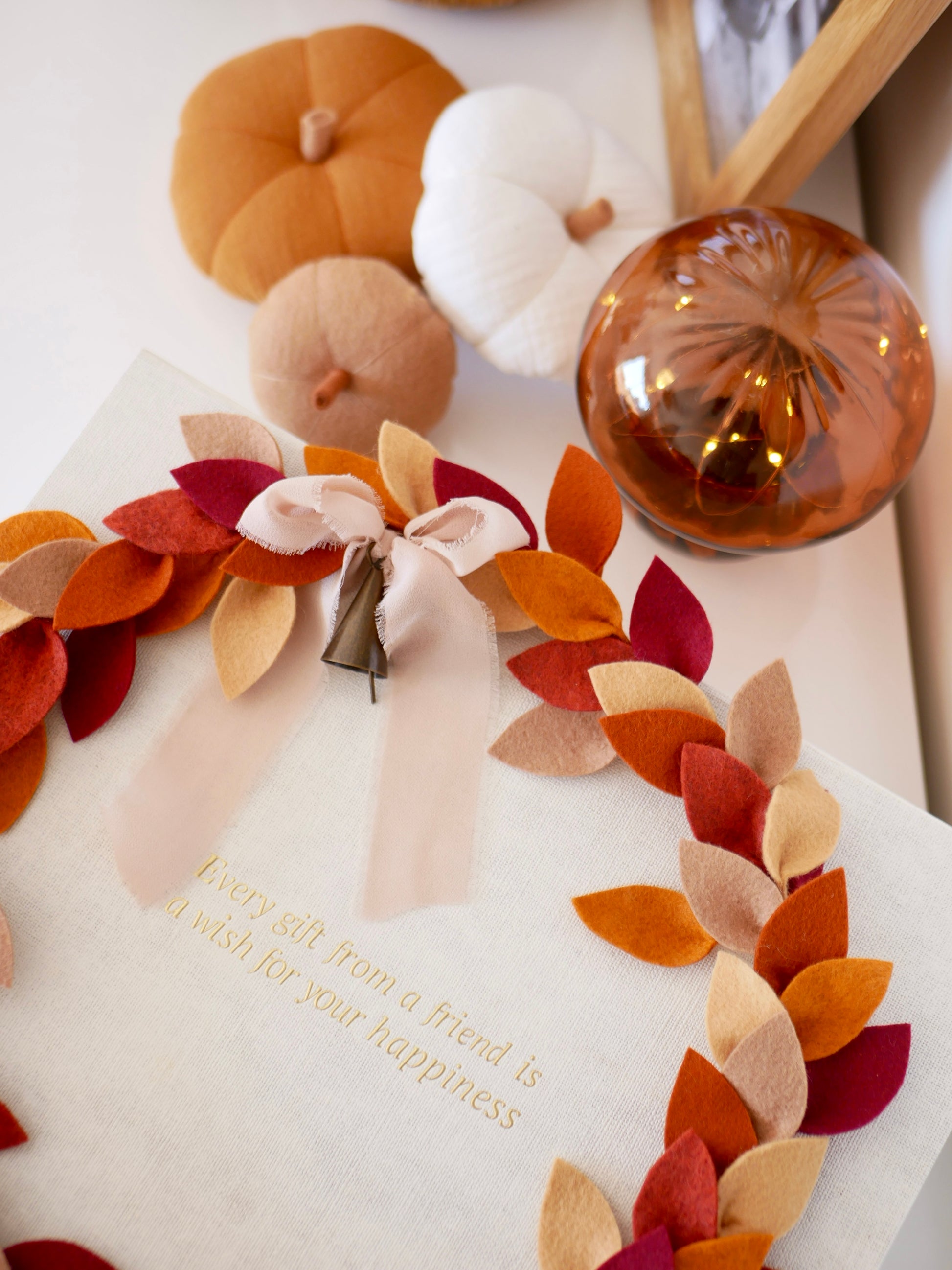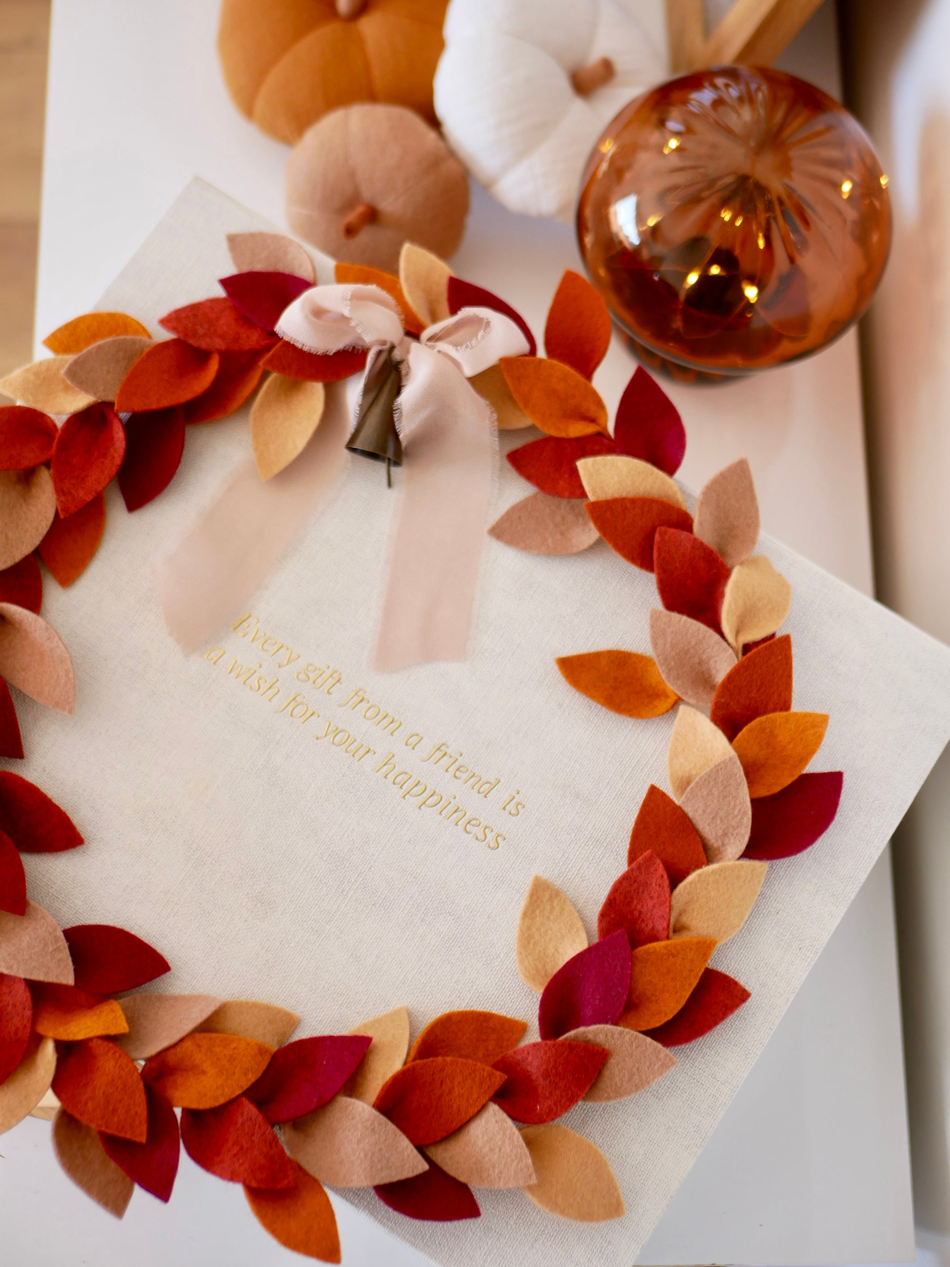 Cette élégante couronne est composée de feuilles de feutrine superposées dans des couleurs automnales.