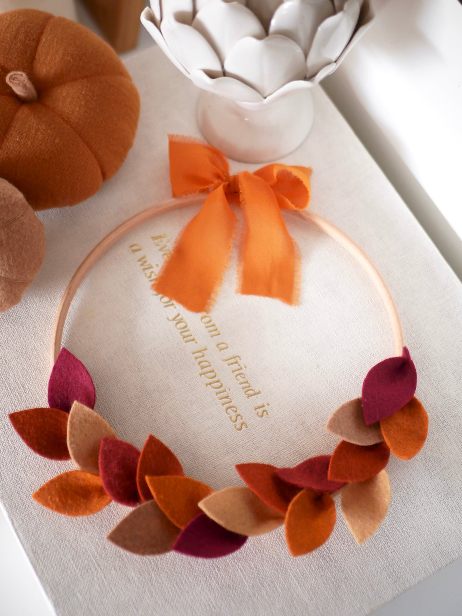 Cette élégante couronne est composée de feuilles de feutrine superposées dans des couleurs automnales.